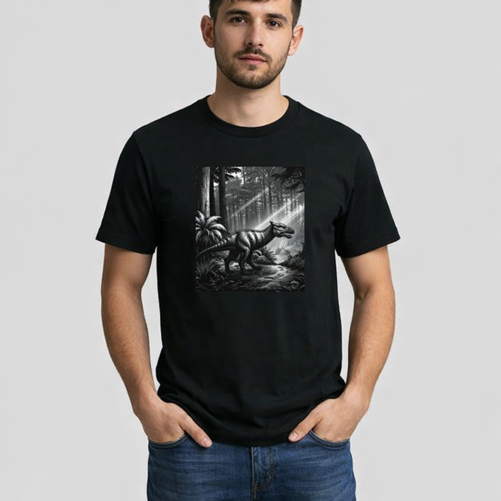 Uma peça exclusiva da Paleo Trend produzida com a alta qualidade da Paleo Trend. A estampa traz um dos predadores mais icônicos do período Jurássico, o Allosaurus, retratado em um cenário de floresta densa iluminada por feixes de luz que atravessam árvores gigantes. O design em preto e branco minimalista cria um contraste elegante, resultando em uma peça versátil que combina facilmente com looks casuais e urbanos. Confeccionada em malha 100% algodão premium, a camiseta garante maciez, conforto e respirabilidade, além de durabilidade superior mesmo após várias lavagens. A modelagem é unissex, com caimento moderno e equilibrado, projetada para vestir bem homens e mulheres em diferentes estilos.